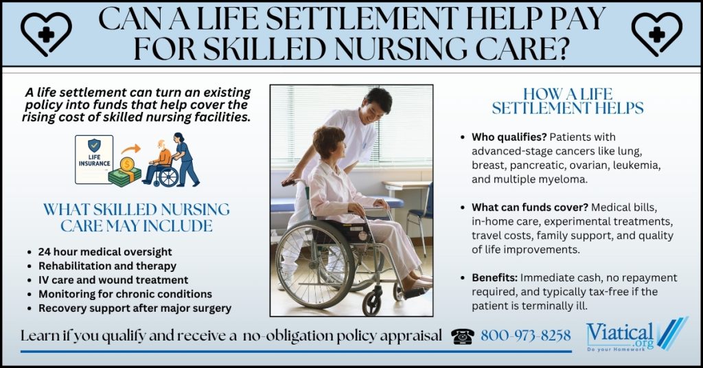 If skilled nursing care has become necessary and the cost is overwhelming, reviewing your life insurance policy can help you understand your options. A life settlement may provide the funding needed to cover high level care without disrupting savings or retirement income. Families often find that this approach gives them more time to focus on health, recovery, and daily comfort.