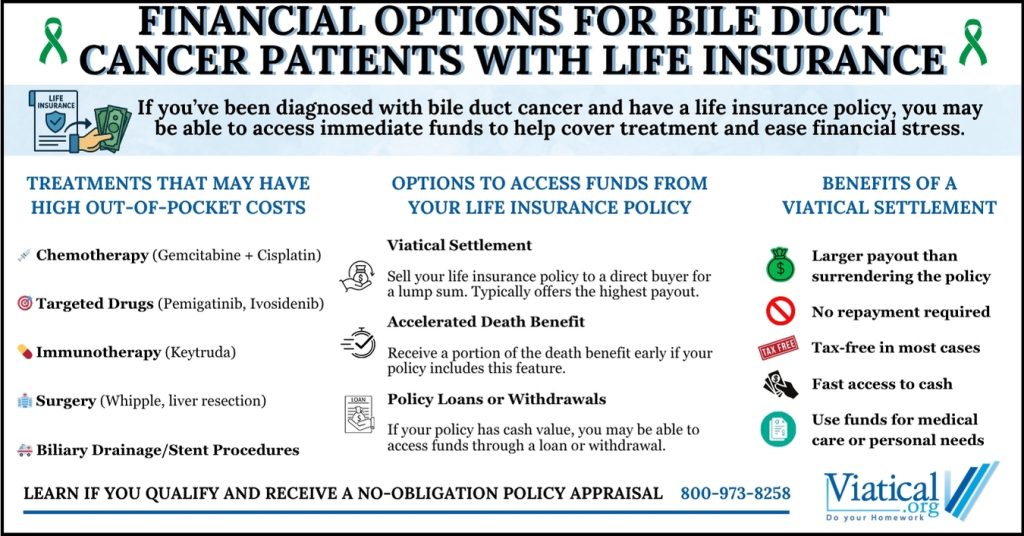 If you or a loved one is facing bile duct cancer and own a life insurance policy, it may be worth exploring whether a viatical settlement is an option. The process typically starts with a no-obligation review of your policy and medical status.