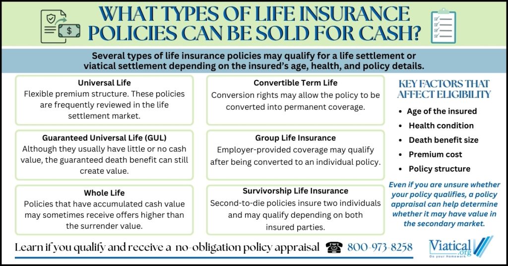 Policyowners often wonder what their options are if they no longer want to keep paying premiums on a life insurance policy. One of the most common questions people ask is what types of life insurance policies can be sold for cash. In many situations, life settlements or a viatical settlement allow a policyholder to sell an existing policy to a licensed purchaser in exchange for a lump-sum payment. The purchaser then becomes responsible for future premium payments and receives the death benefit when the insured passes away.